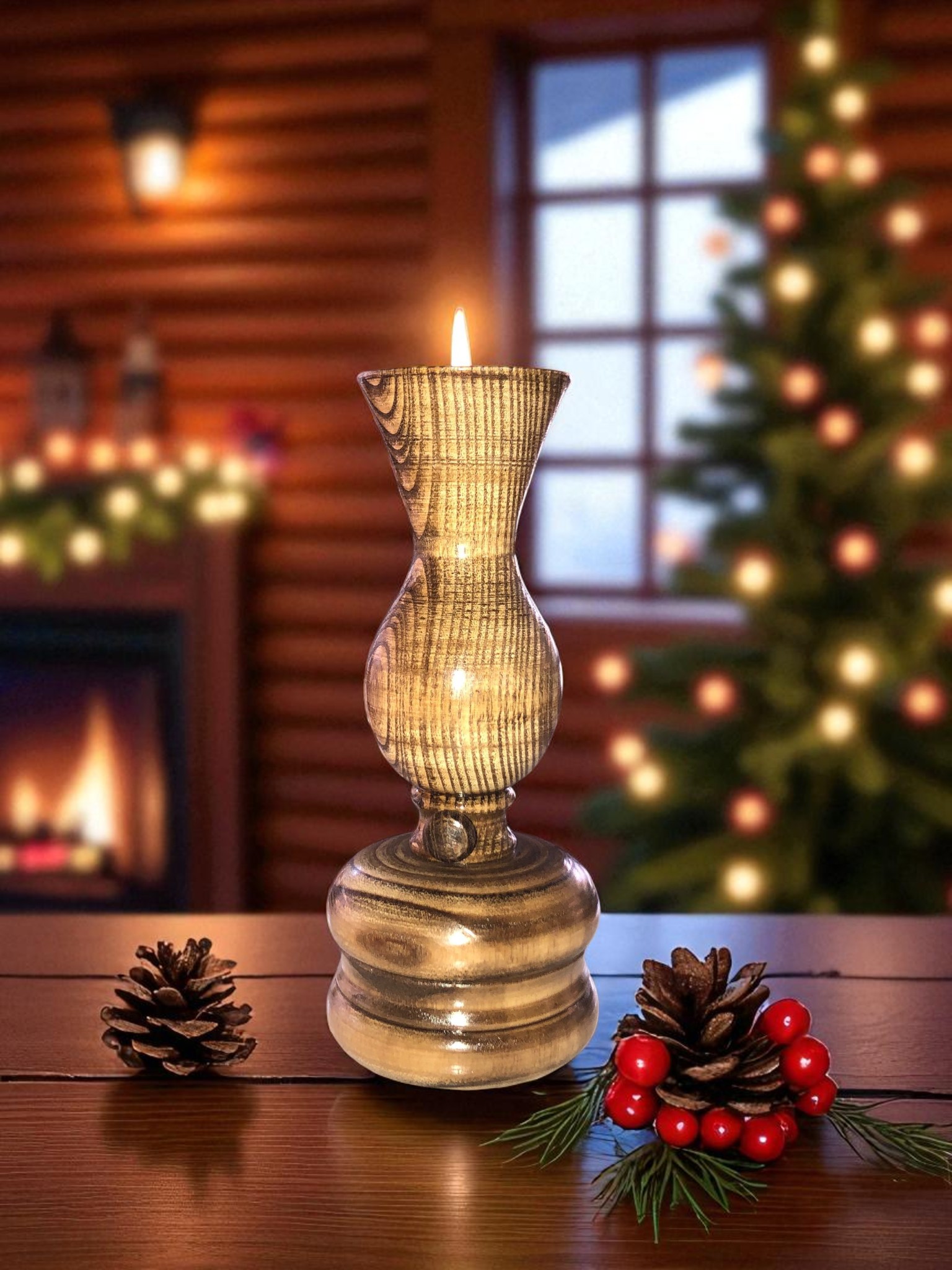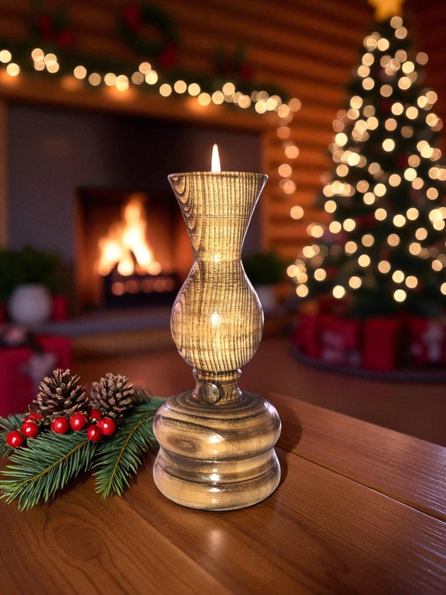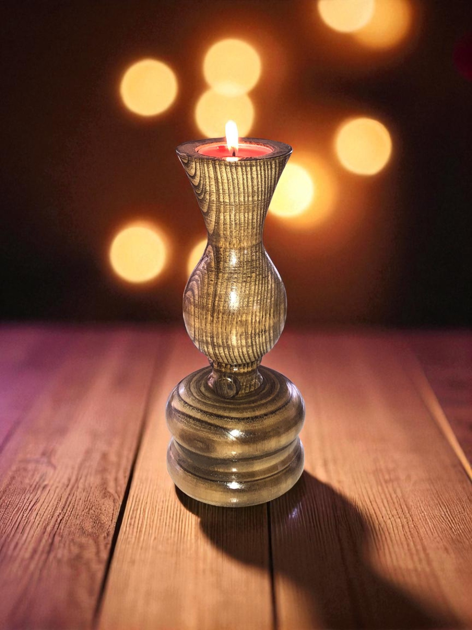 Ahşap Mumluk - Şamdan - Ahşap Şamdan - Gaz Lambası Görünümlü Dekoratif Mumluk - Mumluk - Ceviz Mumluk