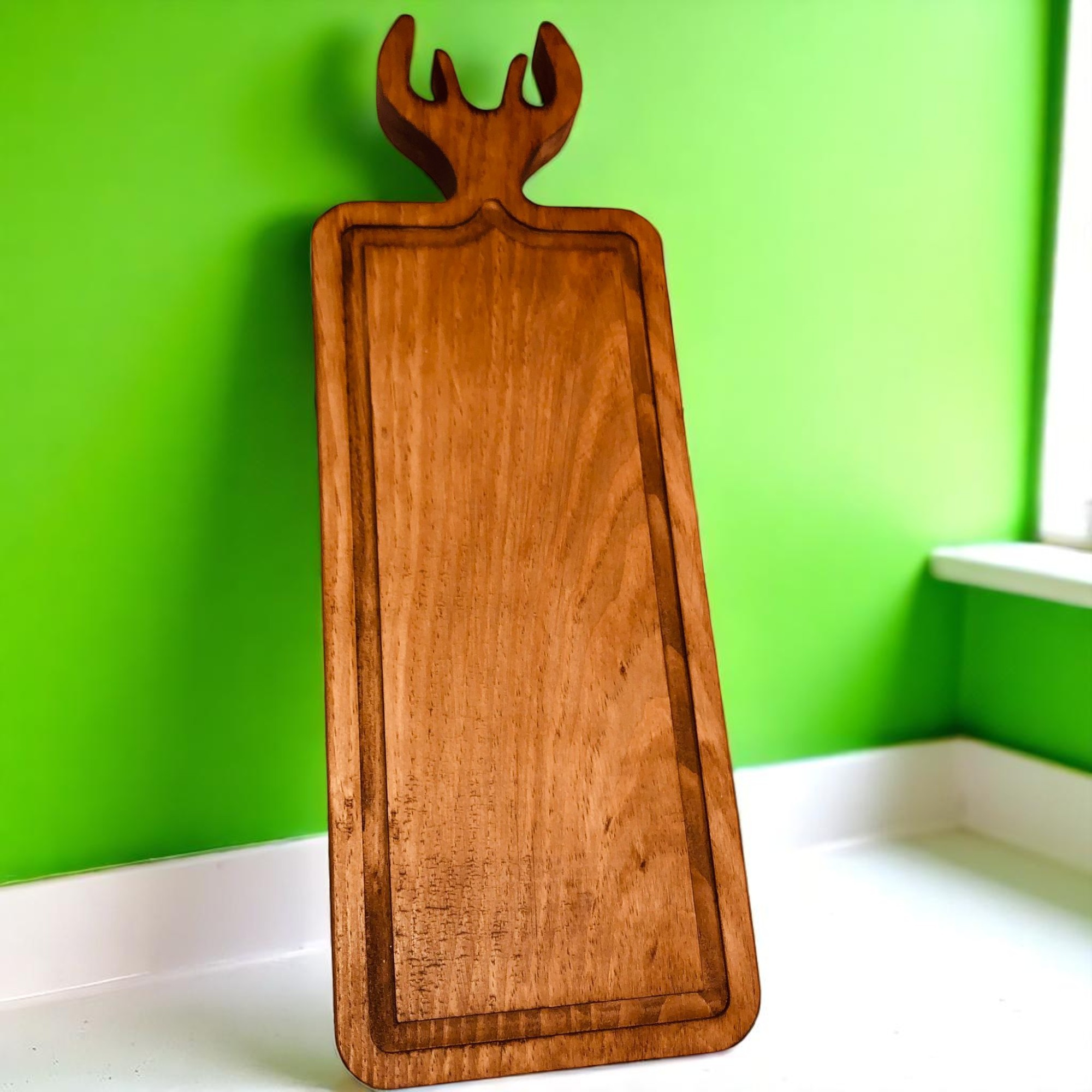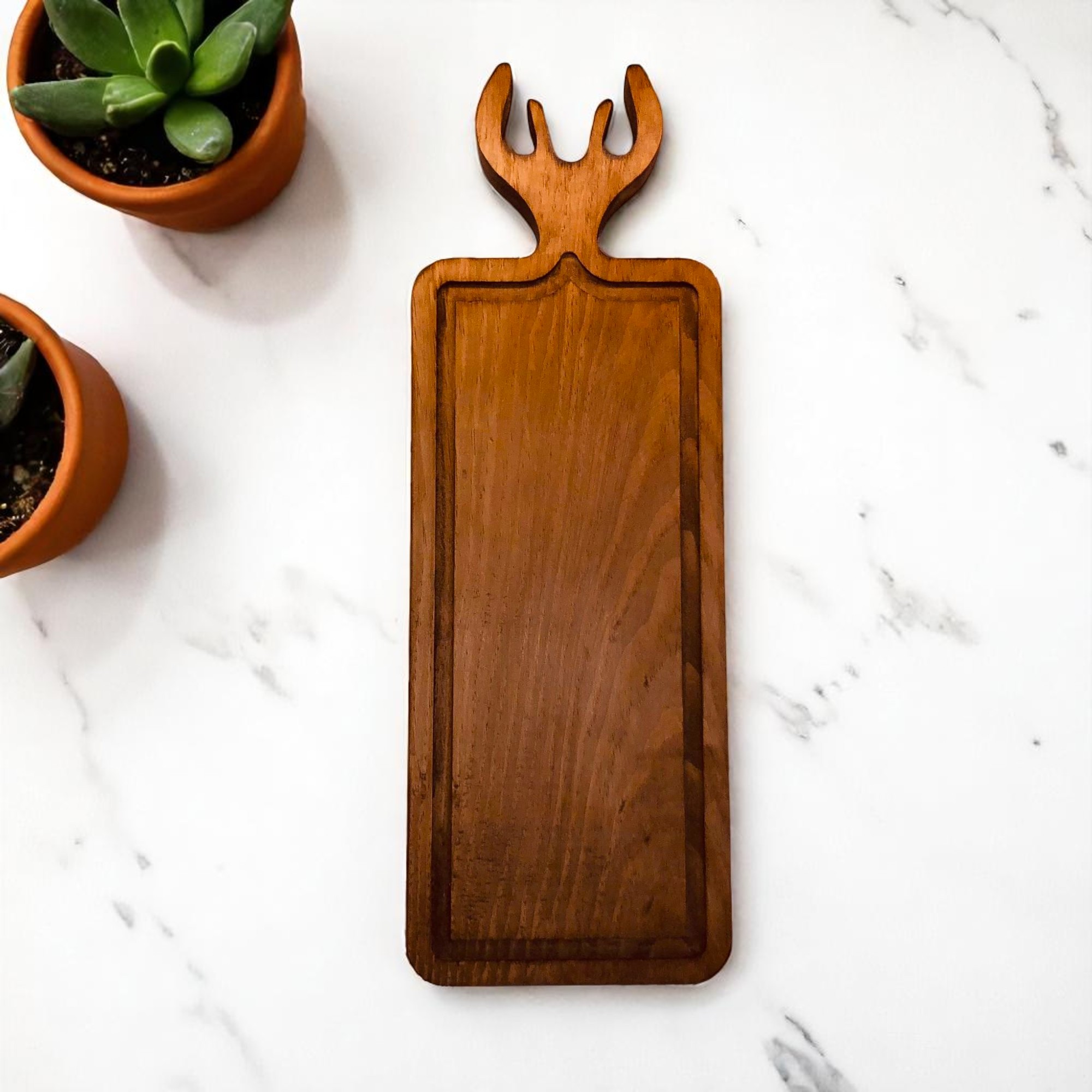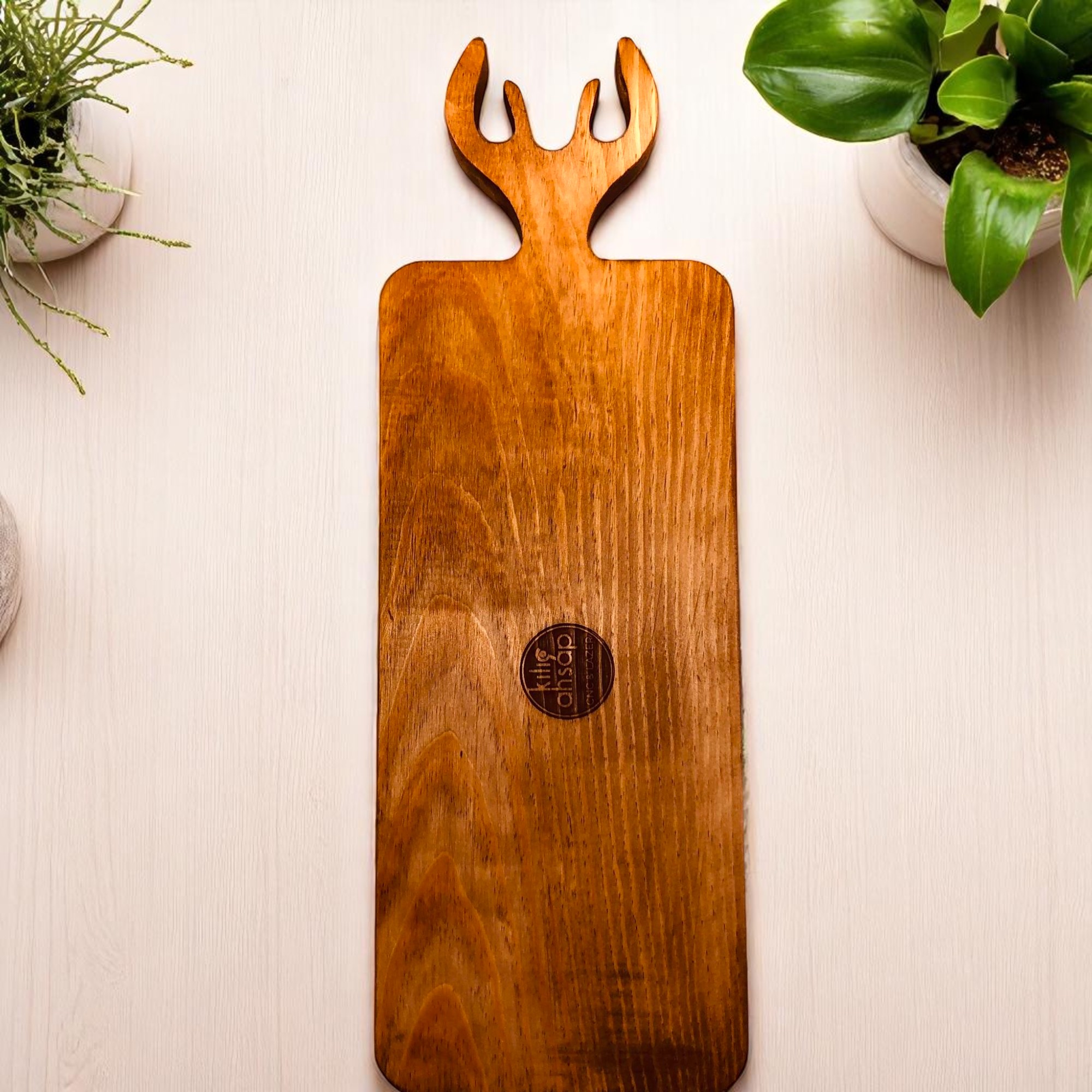 - Geyik deseniyle süslenmiş kesme tahtası, sofralarınıza şıklık katar.; - Güvenle gıda temasına uygun malzemeden üretilmiştir; yiyeceklerinizi rahatlıkla hazırlayabilirsiniz.; - Tek parça halinde gelen bu sunum aracı, minimalist tasarımıyla mutfak dekorasyonunuza kolayca uyum sağlar.; - Dayanıklı ahşap materyali sayesinde uzun süreli kullanım imkanı sunar.; - 38 x 15 cm boyutlarındaki geniş yüzeyi ile büyük porsiyonları bile rahatça servis edebilmenize olanak tanır.; - Fırınlanmış Kızılçam Ağacından üretilmiştir.
